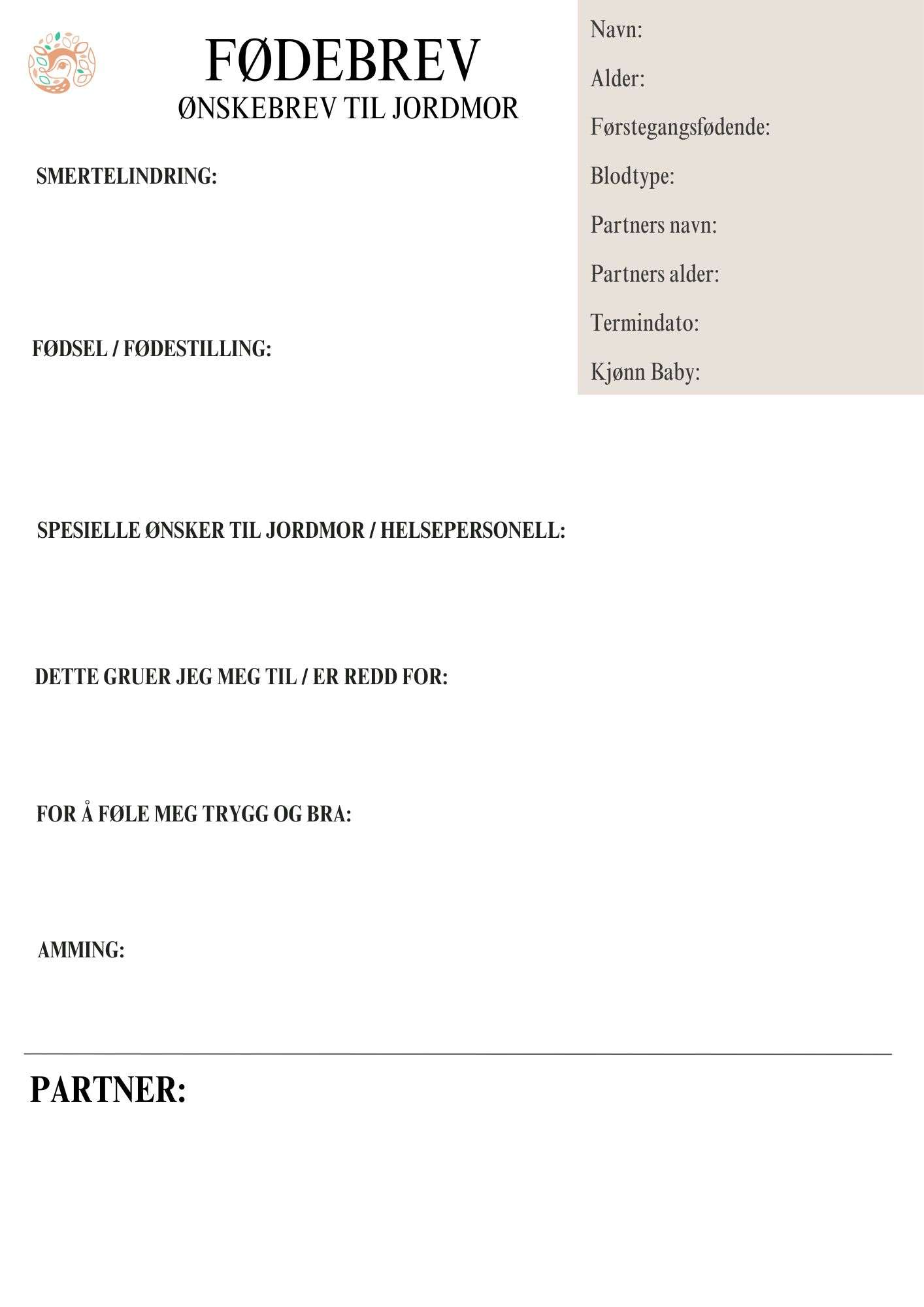 Fødebrev mal - Ønskebrev til jordbor. Malen er inndelt ryddig i overskrifter for hvert aspekt av en fødsel. Smertestillende, fødestilling, spesielle ønsker den fødene har, amming samt et avsnitt partner kan fylle ut.