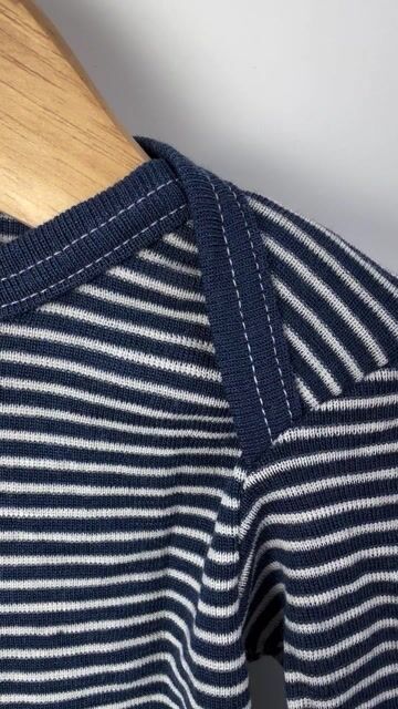 Silkemyk omslagsbody i ull / silke. Perfekt uansett årstid! Cosilana ullbody er blå og hvit stripet, finstrikket i 70% økologisk, ubehandlet Merinoull og 30% økologisk silke. Lange armer, omslag med trykknapper på siden og rundt hele skrittet. Body baby vil oppleve en unik komfort med, både med tanke på hvordan den føles mot hud, samt under skift.