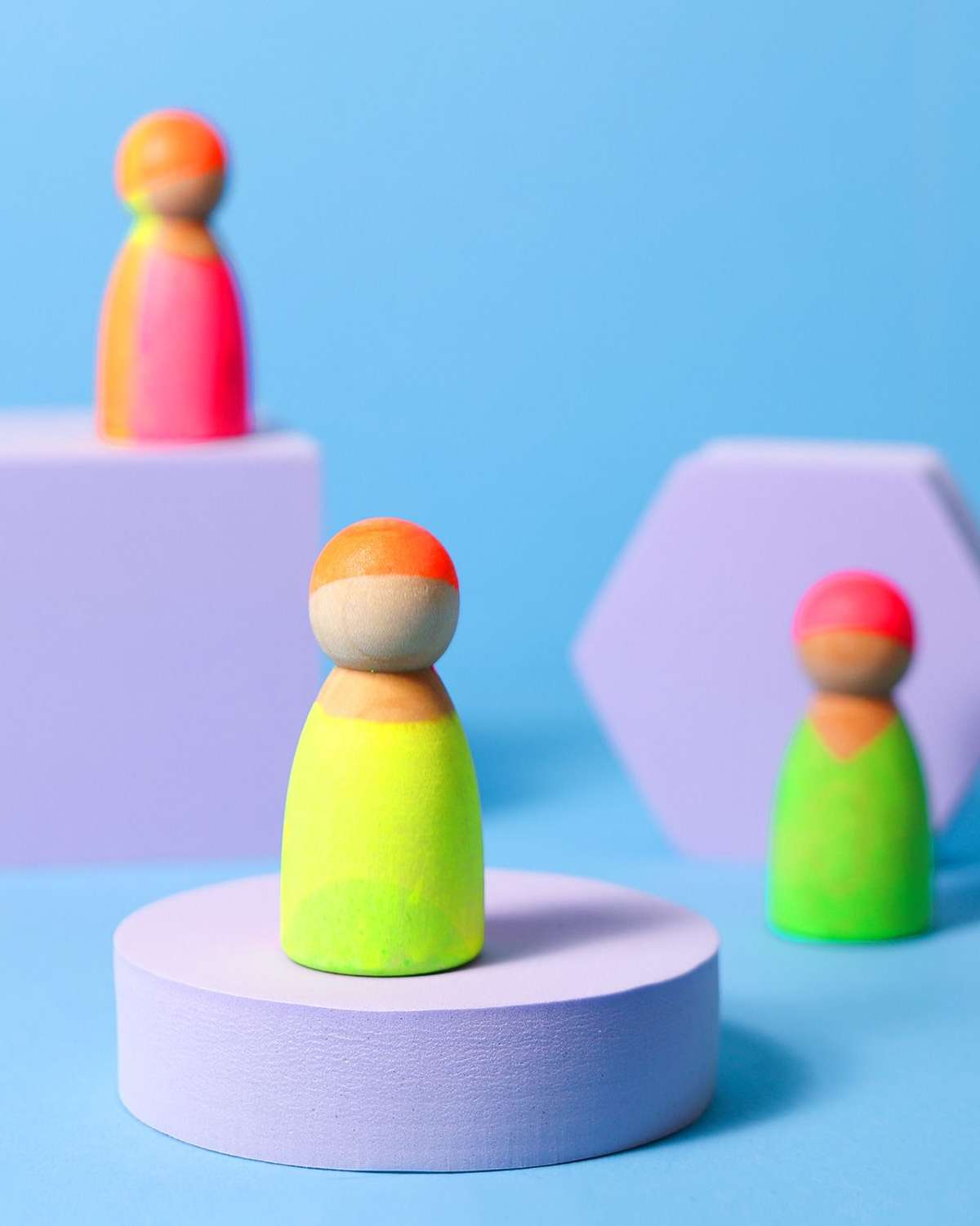 3stk Grimms Regnbuens-venner figurer i neonfarger. Hver figur er 6,5 cm høy, 3cm bred. Laget for hånd av ulik type tresort; Or, Bøk og Lønnetre. Trefigurene er fine til lek med treklosser og dukketeater, så vel som å bruke som dekorasjon med Grimms bursdagsring. F.eks for å sette opp trestaken som en nedtellingskalender til noe. Se videoen under.