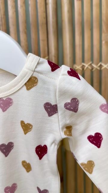Bodyen kommer i en delikat off-white farge med et søtt print av hjerter og puffermer. Se matchende ullbukse.