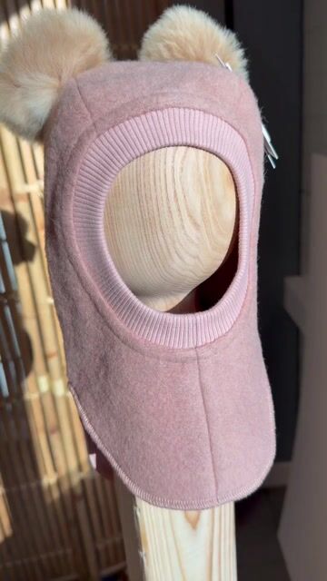 Elefanthut balaclava med ører er den mest populære modellen Huttelihut lue. Her kommer ører i form av to fluffy dusker håndlaget av ren Alpakkaull i Bolivia. Luksus ører! Ellers er luen ensfarget pudderrosa, og er strikket og satt sammen i Polen.