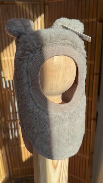 Denne modellen balaclava med ører, kommer med små bamseører. Eller museører om ditt barn foretrekker det 😛 Fargen Cobblestone er en nokså klassisk bamse-beige farge. Lys teddyfarge 😛 Utrolig søt! Luen er strikket og satt sammen i Polen.