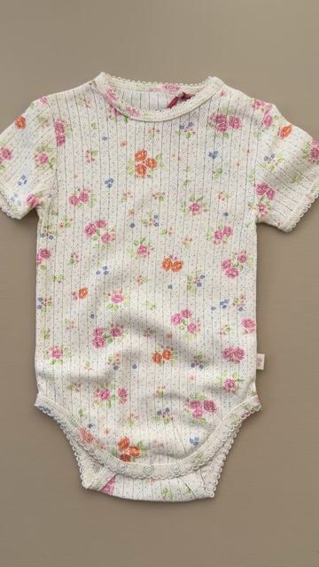 Denne kortermede bodyen i økologisk bomull er et perfekt baseplagg for varme dager og aktive små kropper. Stoffet er ribbestrikket, lett og pustende, og føles ekstra mykt mot sensitiv babyhud. De delikate pointelle-detaljene og det småblomstrete mønsteret gir bodyen et tidløst og rolig uttrykk som passer like godt til hverdag som til små, fine anledninger.