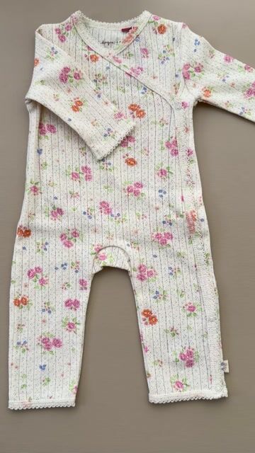 Denne nydelige newborn heldrakten i økologisk bomull er laget spesielt for de aller første dagene, når komfort, mykhet og praktiske løsninger betyr aller mest. Det ribbestrikkede stoffet med delikate pointelle-detaljer føles lett og behagelig mot sensitiv nyfødt-hud, og det småblomstrete mønsteret gir et rolig, tidløst uttrykk som aldri går av moten.