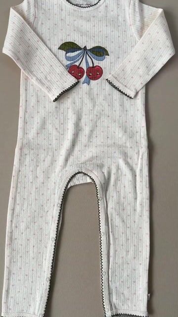 Denne myke heldrakten i økologisk bomull er et gjennomtenkt baseplagg som passer perfekt til både lek, hvile og søvn. Stoffet er ribbestrikket, lett og pustende, og føles ekstra behagelig mot sensitiv barnehud. De fine musel-detaljene gir et nostalgisk preg, mens det søte kirsebærmotivet foran gjør uttrykket lekent og sjarmerende.