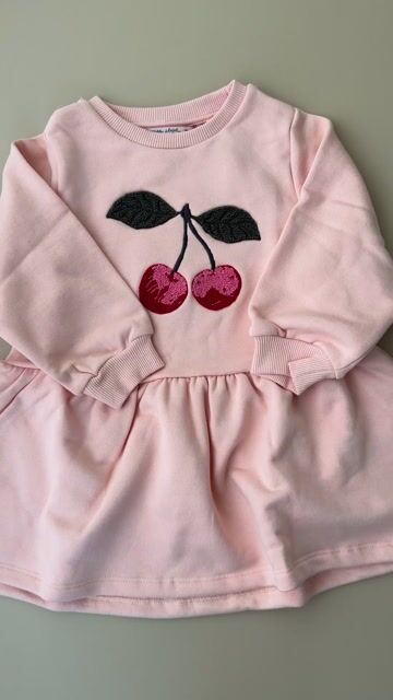 Det broderte kirsebærmotivet på brystet gir kjolen et lekent og nostalgisk uttrykk, mens den duse rosatonen gjør den enkel å style, både med strømpebukse, leggings eller bare bare ben på varme dager.