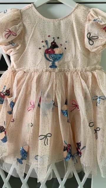 Kortermet tyllkjole dekorert med glitrende paljetter. Kjolen er kremhvit med fargerike paljetter i fine nyanser som danner søte motiver; Iskrem i et glass og sløyfer. Konges Sløjd kjole har masse volum i tyllskjørtet med to lag tyll og underkjole. Underkjolen er i bomull som passer på at barn ikke opplever det som ubehagelig eller klamt. Kjolen har elastisk cutline i midjen med oppsamlet tyll for å passe på at det skal være ordentlig gøy å snurre med den.