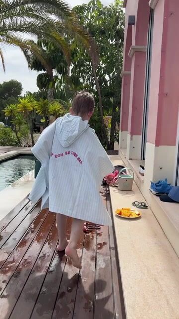 Badeponcho istedenfor håndkle er både praktisk å deilig å ha med seg for bading på strand, basseng eller badeland: Pakker godt inn samt gir barn mulighet å løpe fritt selv våt i litt kjølig vind.