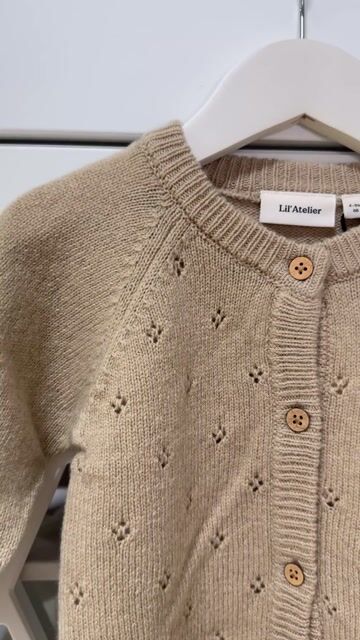 Dressen kommer i en varm, nøytral beige tone som passer til alt. Hele plagget er pyntet med et delikat hullmønster som gir et klassisk, nostalgisk uttrykk. Knappelukking hele veien foran gjør den superpraktisk i hverdagen – lett å ta på, lett å ta av (også midt i bleieskiftkaoset).