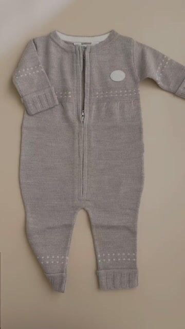 Lillelam ulldress lukkes med en sentrert glidelås og kommer med ribbestrikket brettekanter rundt håndledd og ankler. Ulldressen vil kunne vokse litt med baby. Passformen er deilig og løs fra midjen og ned, med en svak innstrammet i midjen. Utrolig deilig passform mtp krabbing og soving.