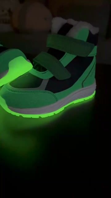Ensfarget marineblå topp, hvit mellomsåle og kontrastfarget limegrønn undersåle. Hvit fuskepels. Store reflekspaneler. Når lysene slukkes, lyser overdelen opp med en magisk glød! Viking-logo.