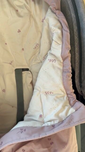 Det lyserosa ytterstoffet består av 60% bomull og 40% polyester, som deretter er impregnert miljøvennlig. En gjennomtenkt blanding for å gi en vindtett og vannavstøtende vår- og sommerpose som lar luften sirkulere mest mulig. Polyester gir bomull ekstra slitestyrke og letthet. De horisontale sømmene passer på at fyllet holder seg fluffy og på plass. Samt at barnet opplever posen som luftig og lett, selv godt pakket inn.