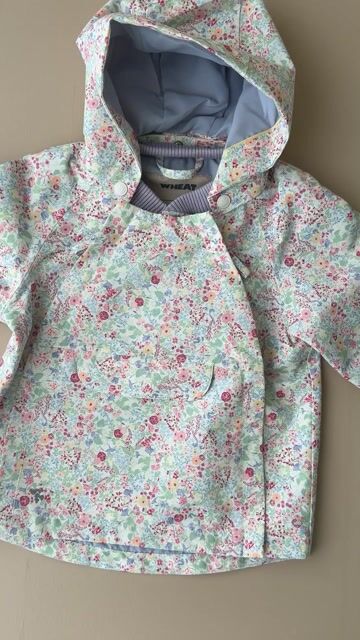 Wheat jakke i fargen Cool Sky Flowers er dekorert med et blomstrete mønster i rosa, grønn, gul og lilla pastellnyanser på en lys kremhvit bakgrun. Mønsteret er i fine, duse pastellnyanser. Lilla i detaljene som krage. Lys blå innside. I tillegg til den søte fargen og mønsteret, er Wheat jakke designet med en sentrert frontlomme , refleks foran og bak på ryggen og strikk rundt håndleddene.
